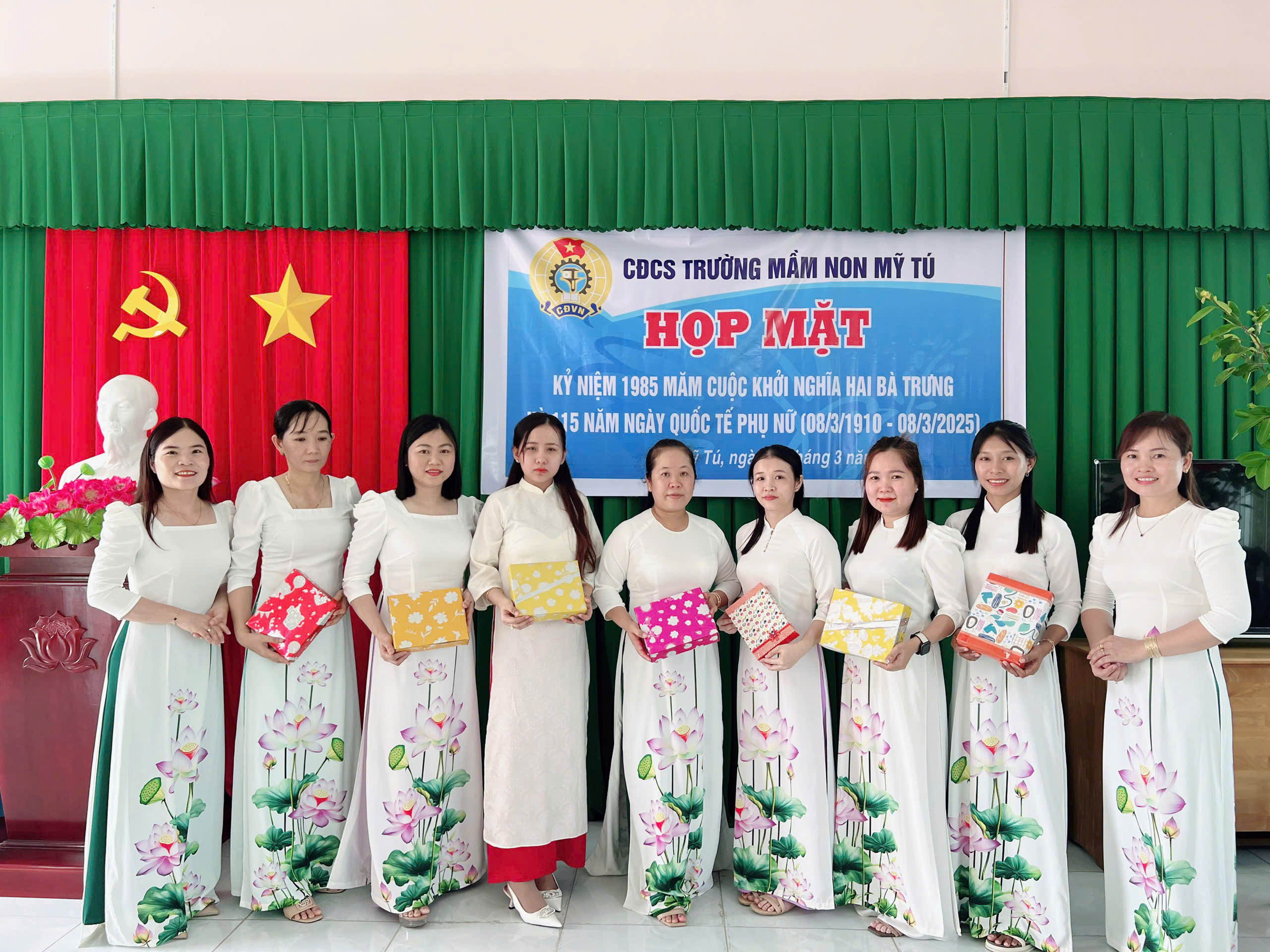 Thực hiện theo Hướng dẫn số 20/HD-LĐLĐ, ngày 14/02/2024 của Liên đoàn Lao động huyện Mỹ Tú về việc tổ chức các hoạt động kỷ niệm 115 năm ngày Quốc Tế Phụ Nữ (08/3/1910 - 08/3/2025) và 1985 năm Khởi nghĩa Hai Bà Trưng. Nhằm chào mừng kỹ niệm 115 năm ngày Quốc Tế Phụ Nữ (8/3) gắn với 60 năm phong trào “Ba đảm đang” và 1985 năm Khởi nghĩa Hai Bà Trưng Công đoàn cơ sở Trường mầm non Mỹ Tú tổ chức họp mặt nhằm: