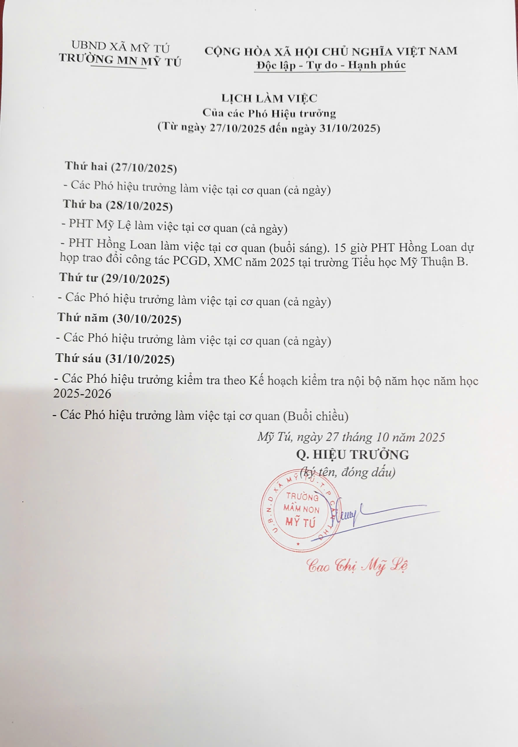LỊCH LÀM VIỆC CỦA CÁC PHÓ HIỆU TRƯỞNG NGÀY 27/10 ĐẾN 31/10/2025