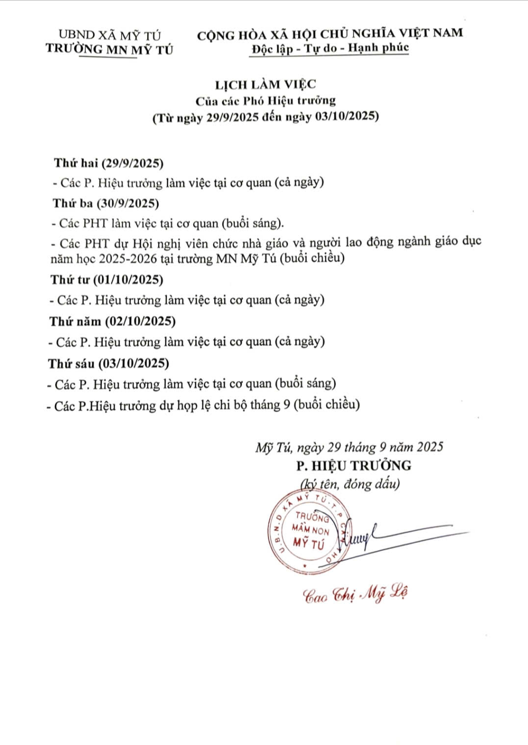 LỊCH LÀM VIỆC CỦA CÁC PHÓ HIỆU TRƯỞNG NGÀY 29/9 ĐẾN NGÀY 03/10/2025