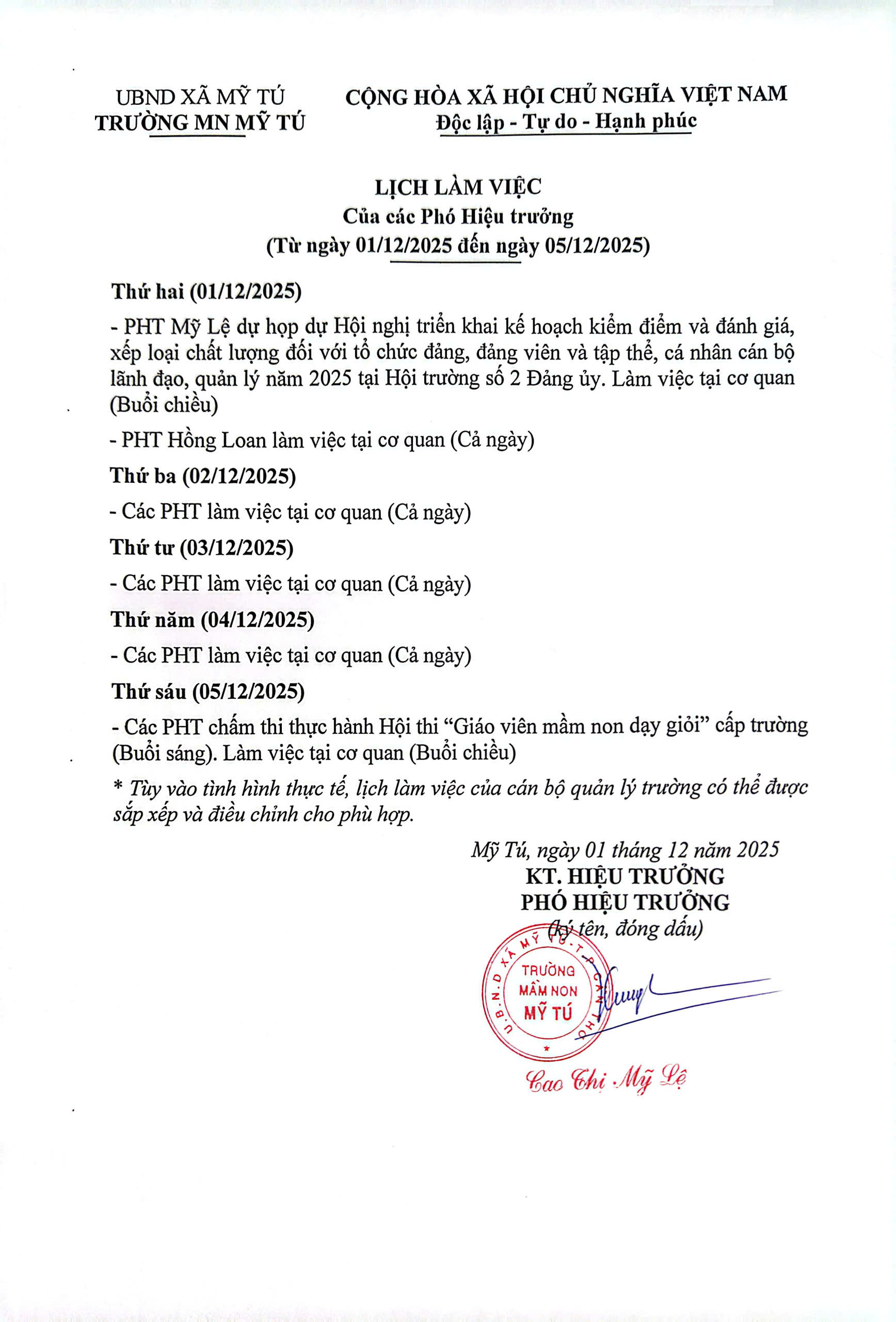 LỊCH LÀM VIỆC CỦA CÁC PHÓ HIỆU TRƯỞNG (TỪ NGÀY 01/12 ĐẾN 05/12/2025)