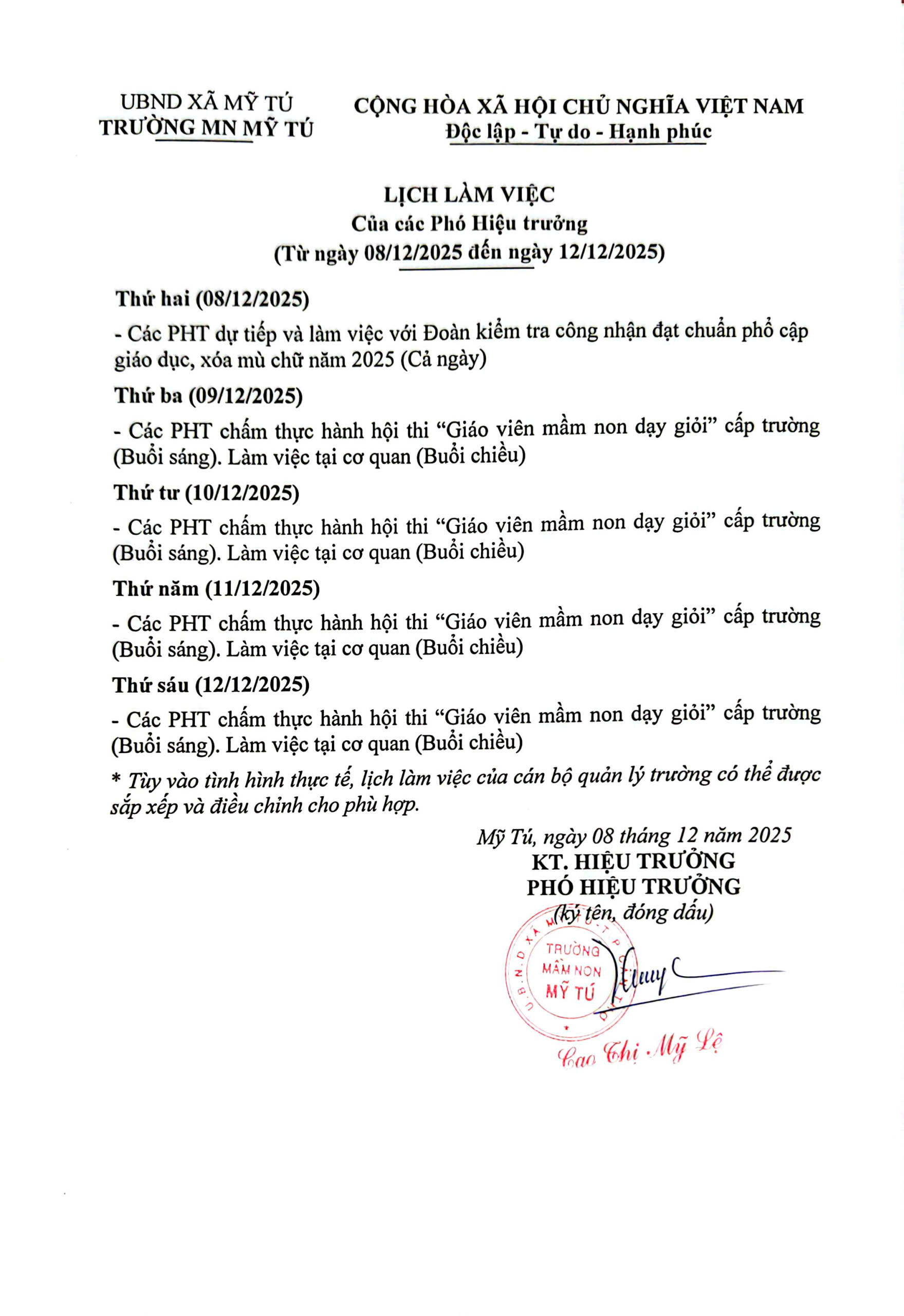 LỊCH LÀM VIỆC CỦA CÁC PHÓ HIỆU TRƯỞNG (TỪ NGÀY 08/12 ĐẾN 12/12/2025)