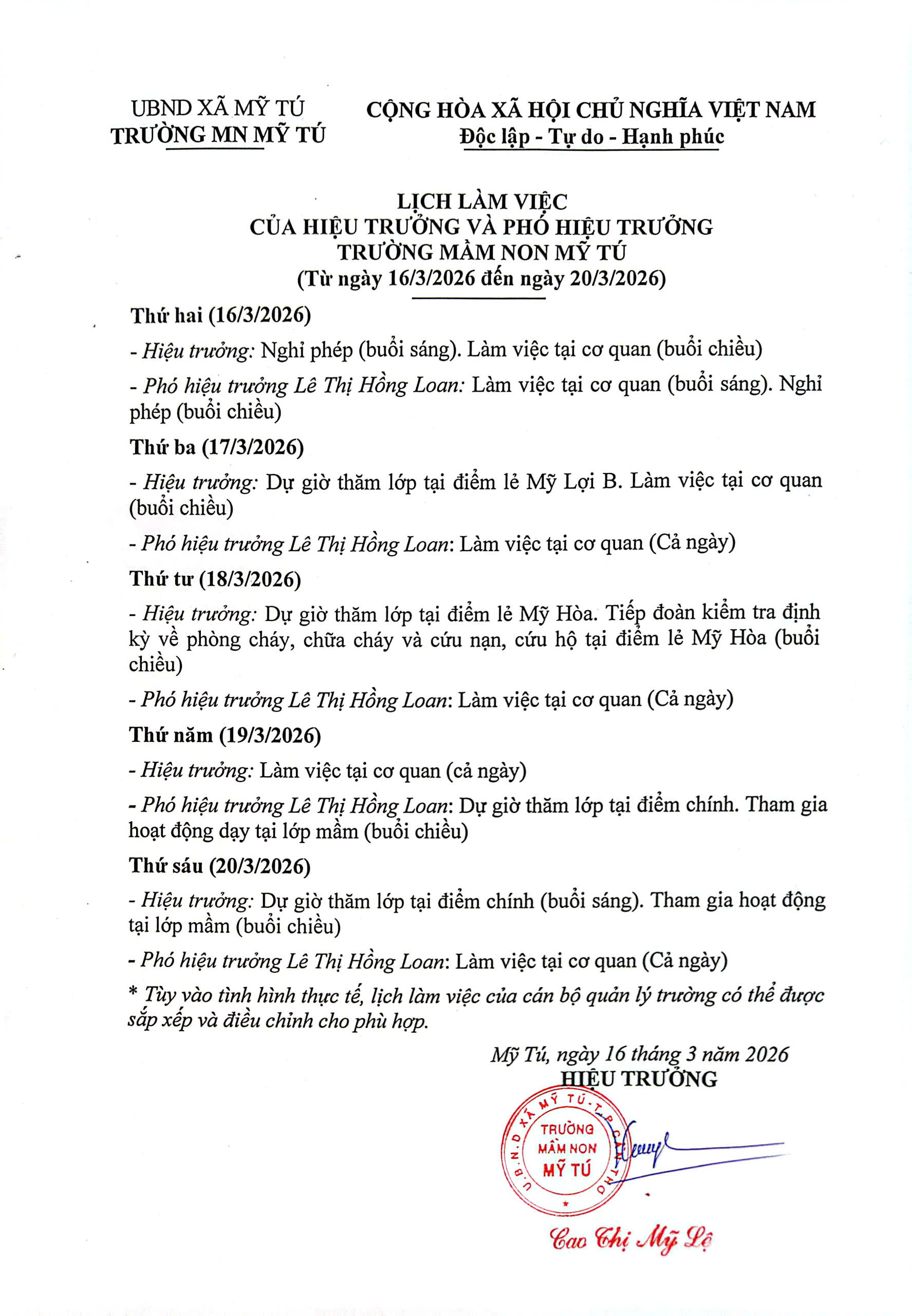 LỊCH LÀM VIỆC CỦA HIỆU TRƯỞNG VÀ PHÓ HIỆU TRƯỞNG TRƯỜNG MẦM NON MỸ TÚ (Từ ngày 16/3/2026 đến ngày 20/3/2026)