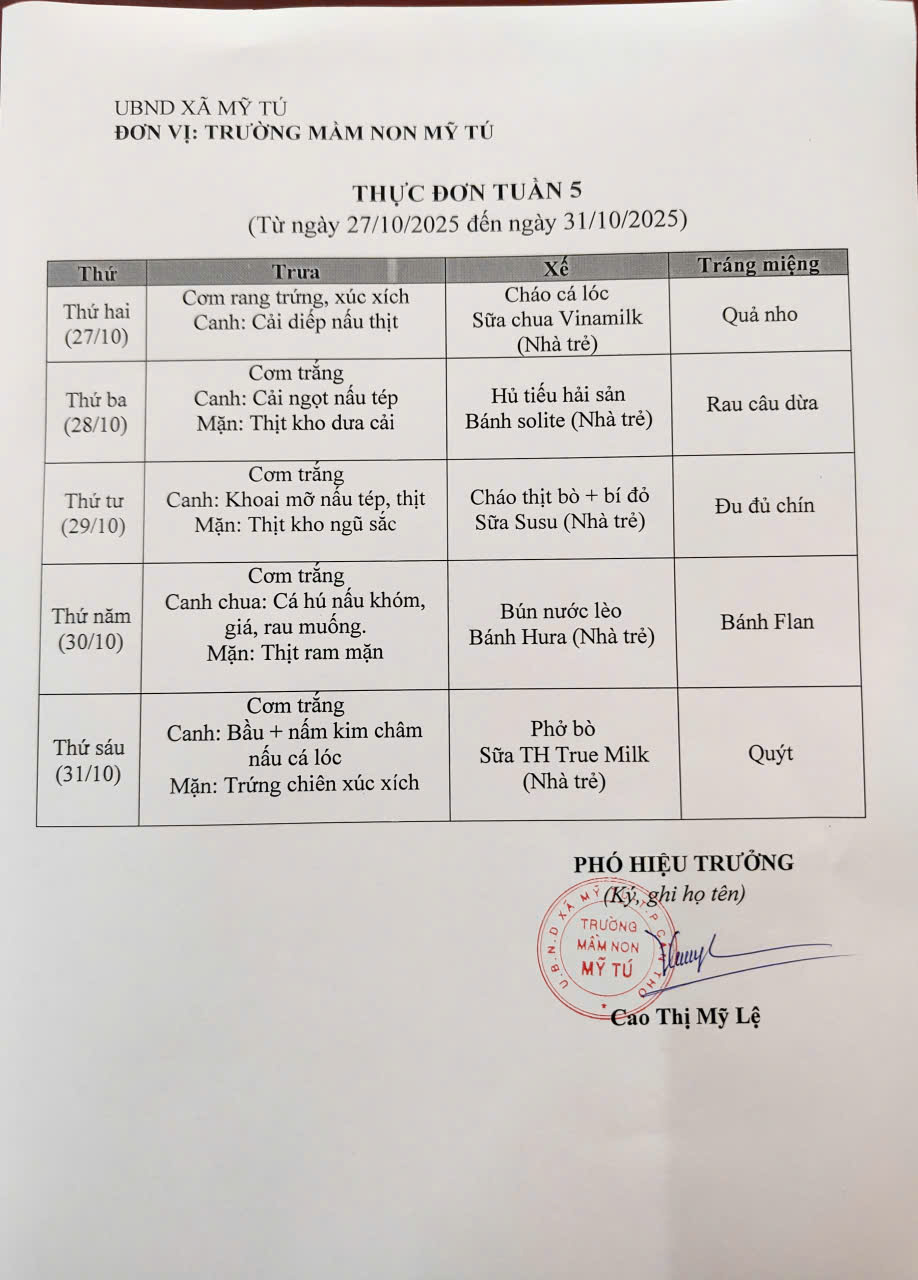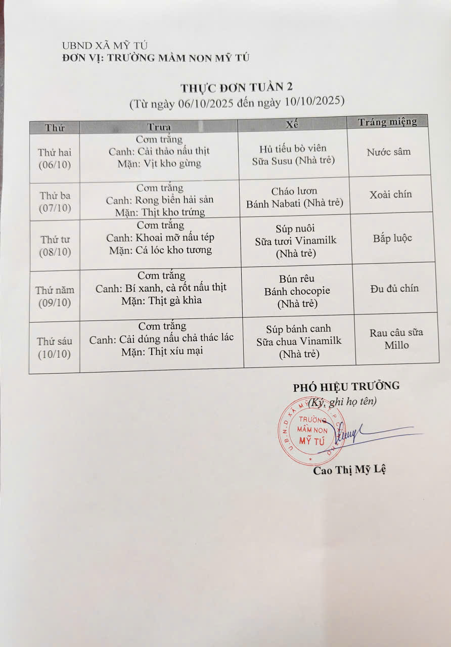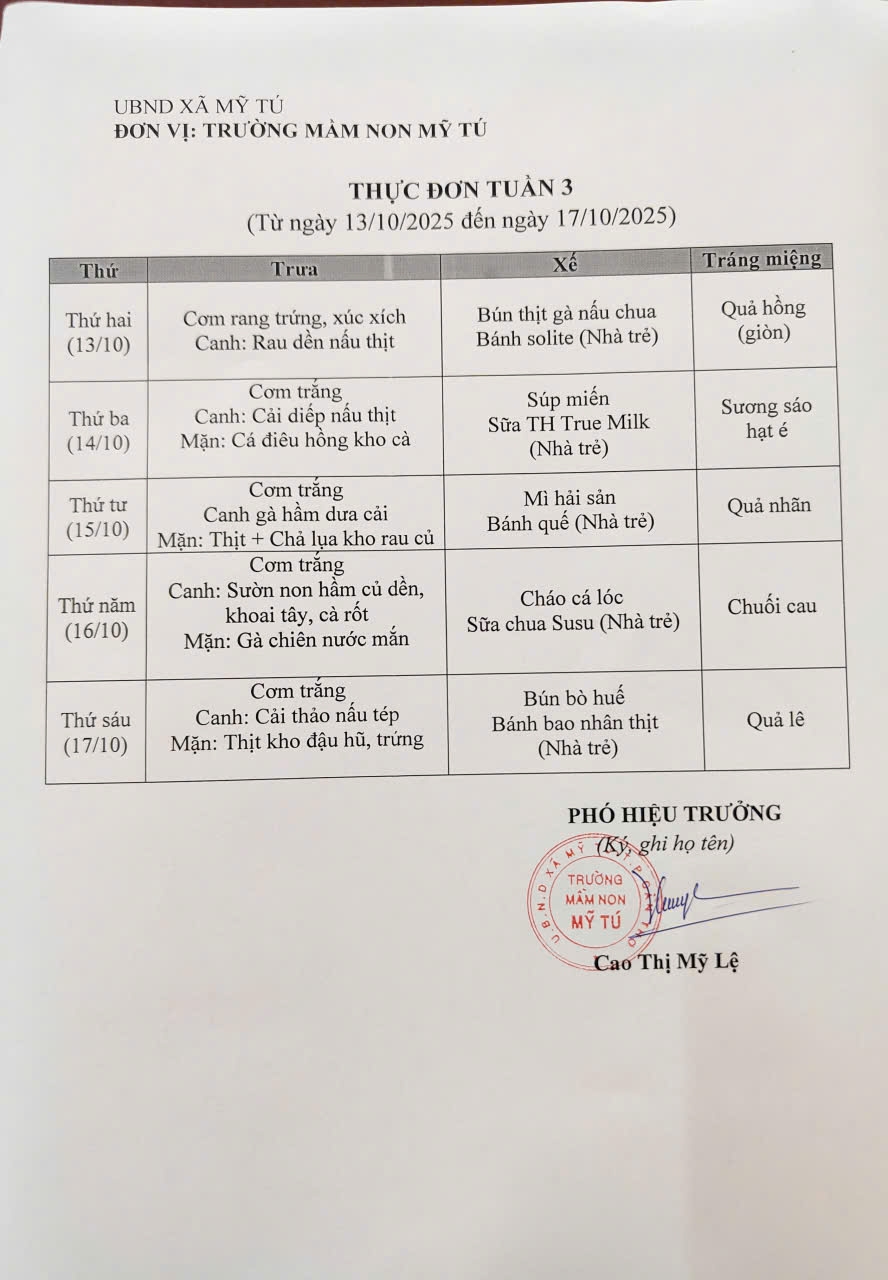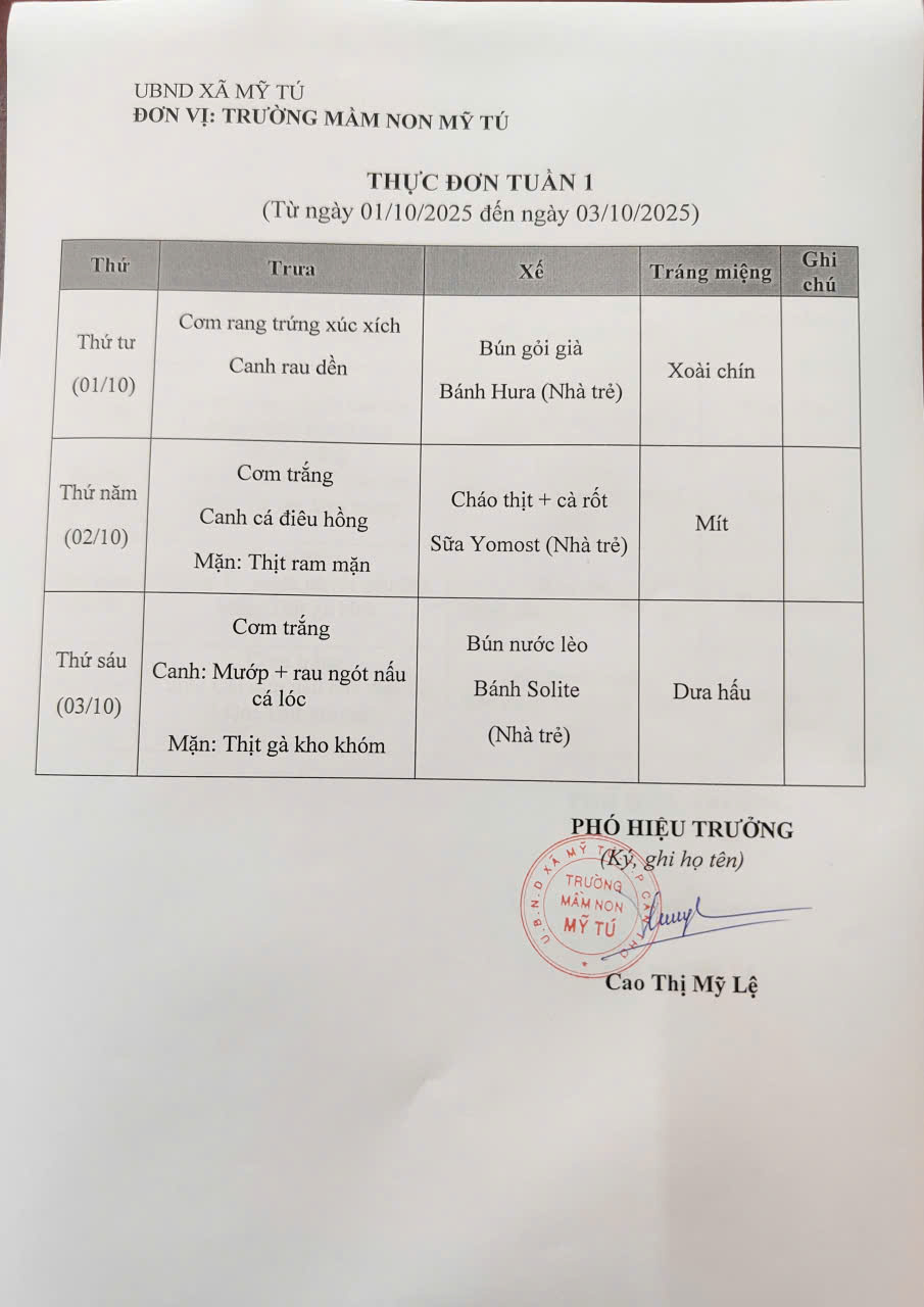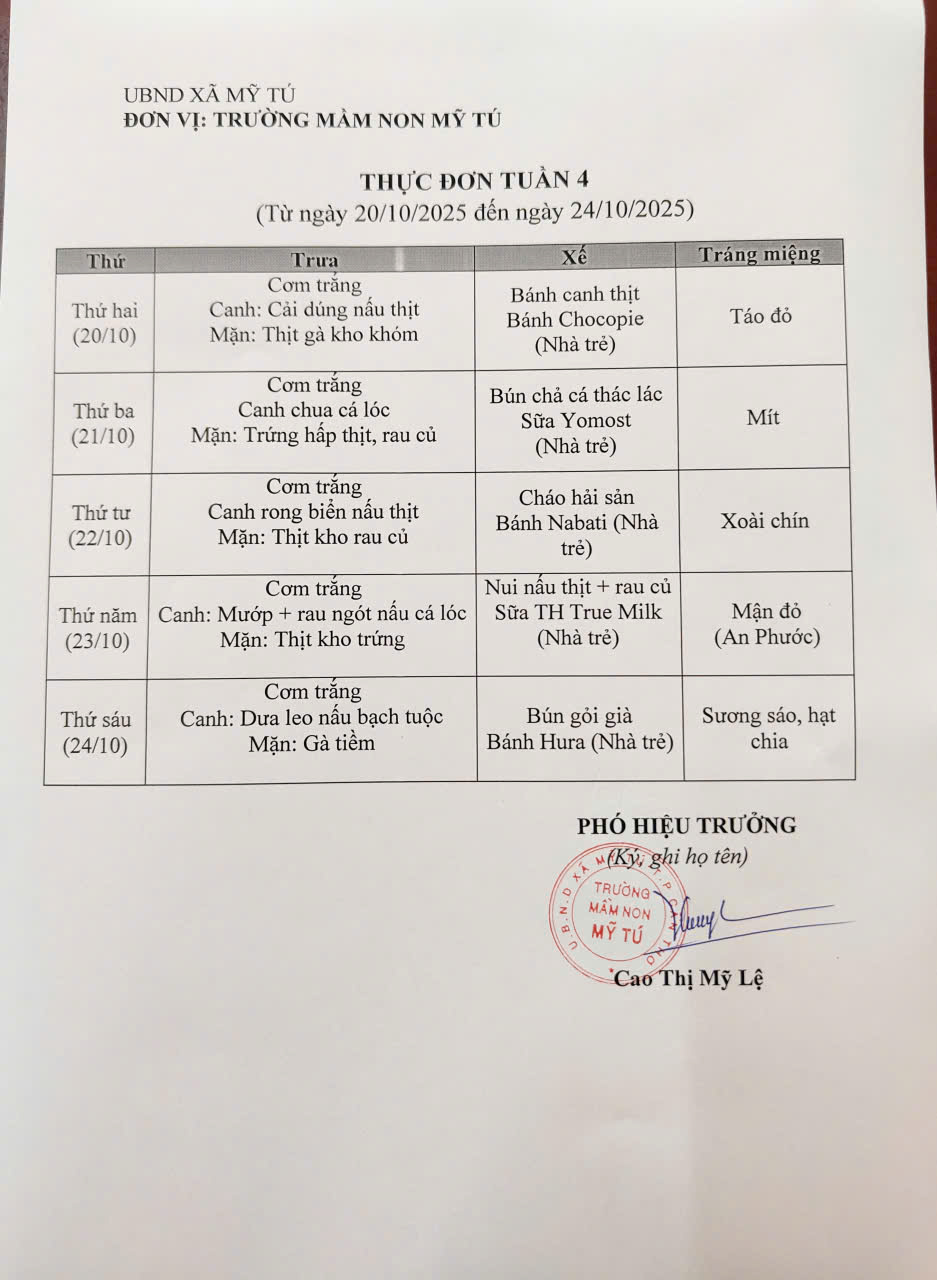 Thực đơn tháng 10 (Từ ngày 01/10 đến ngày 31/10/2025)